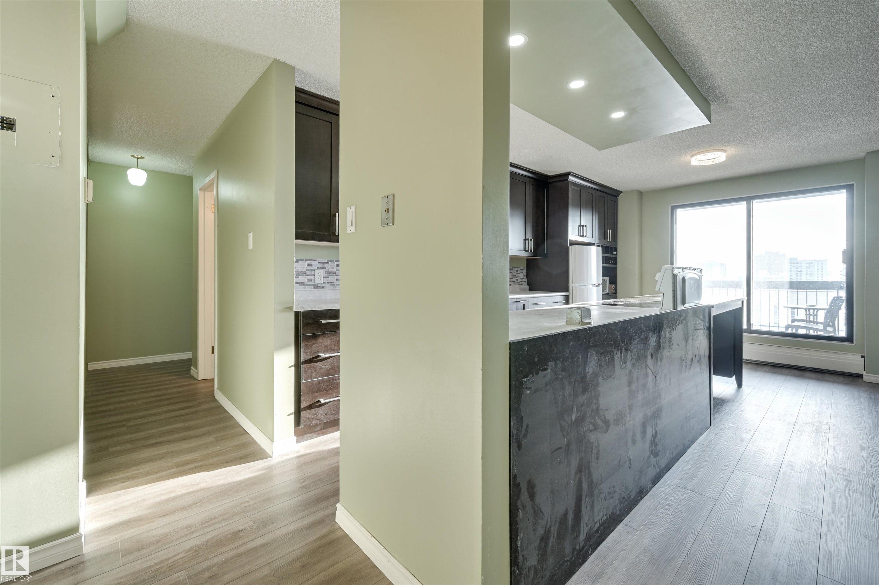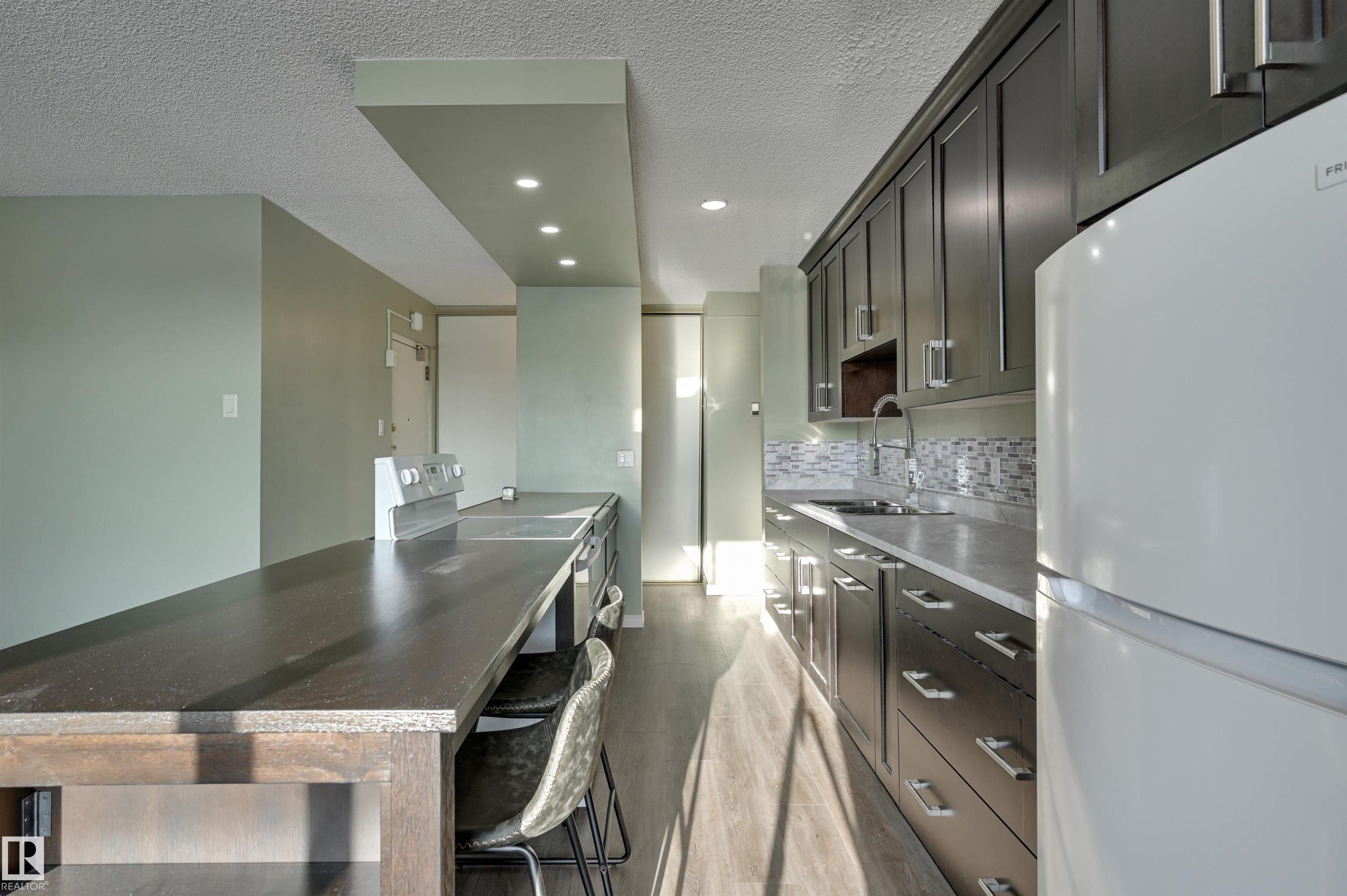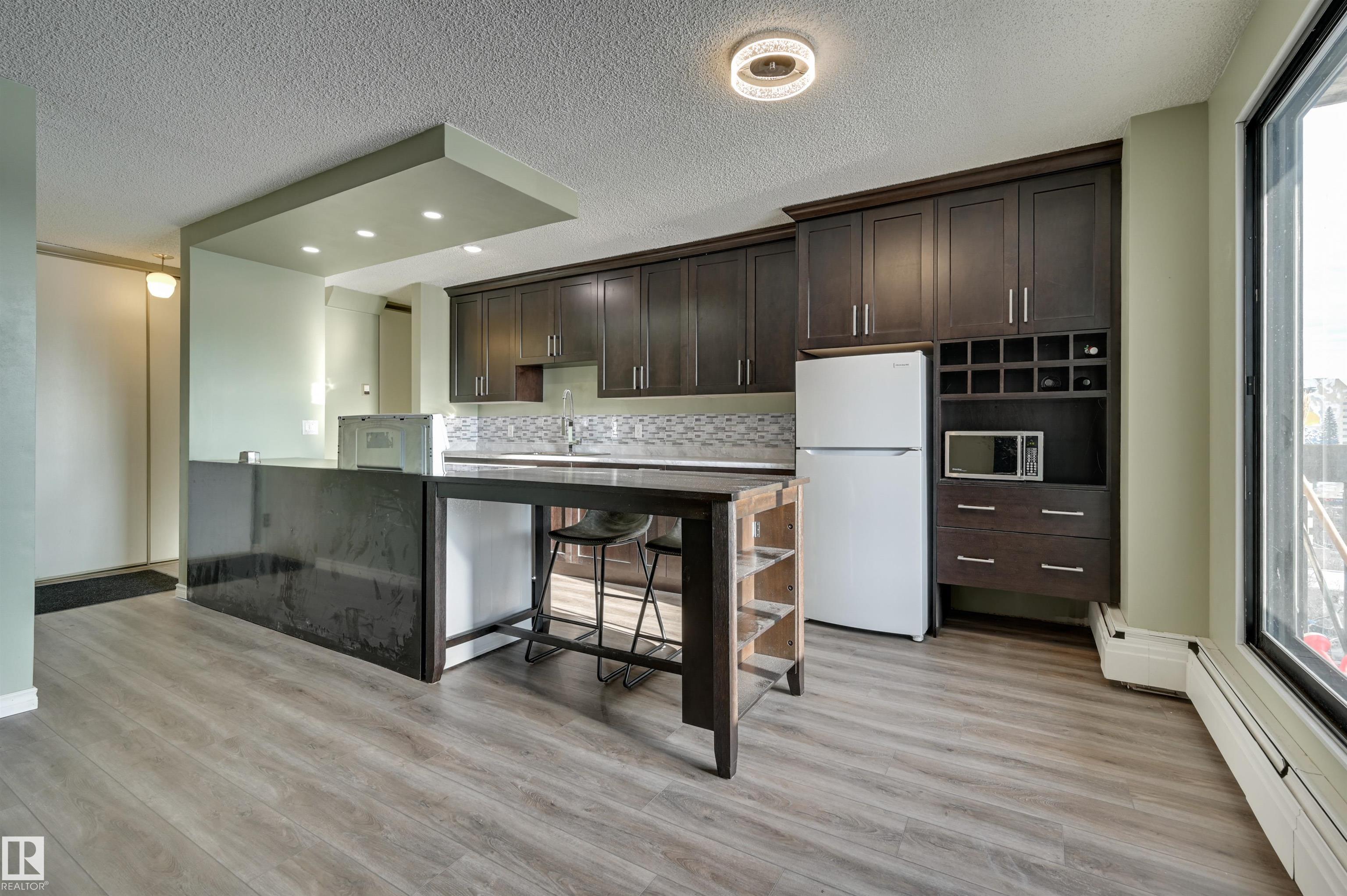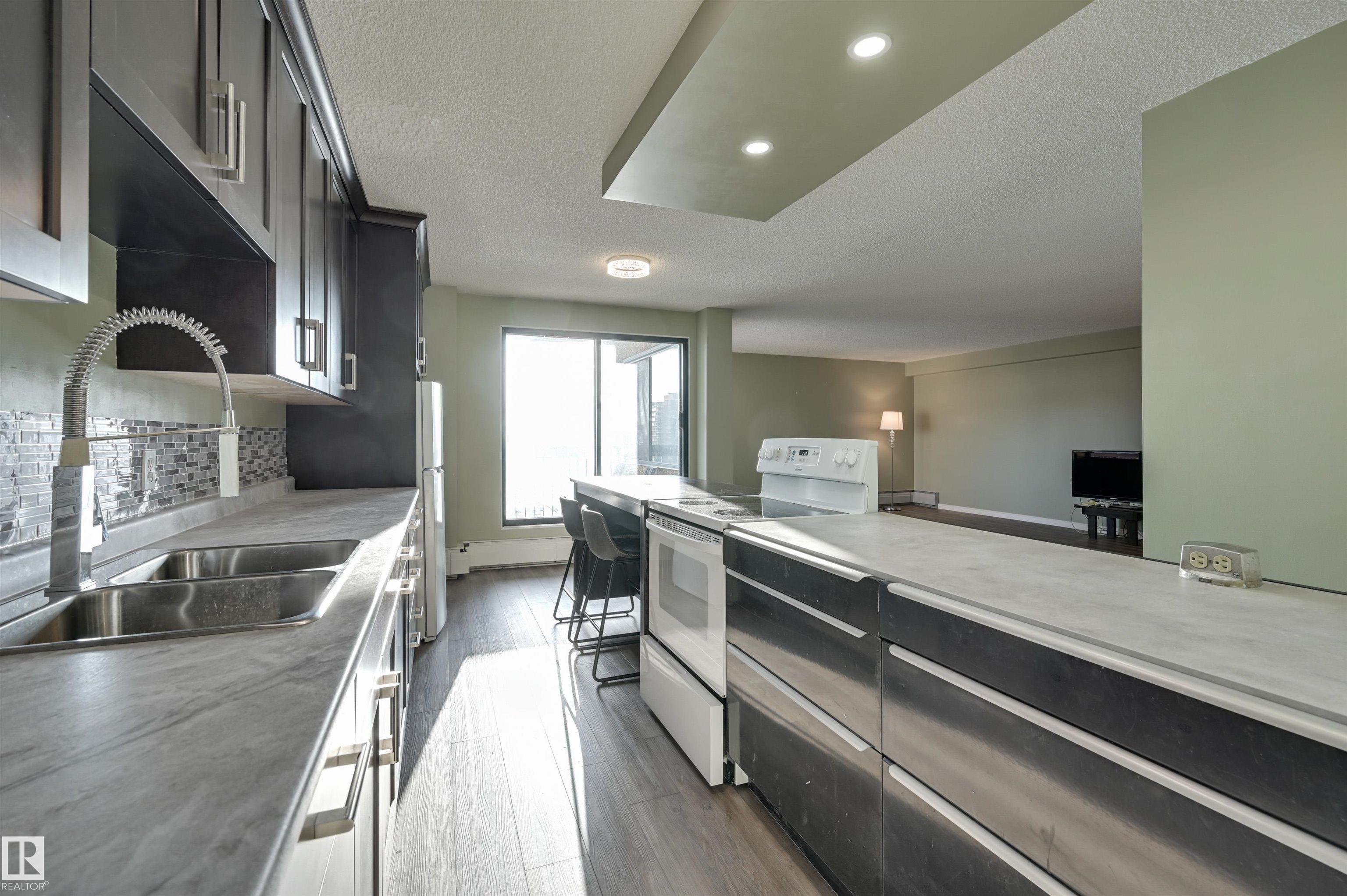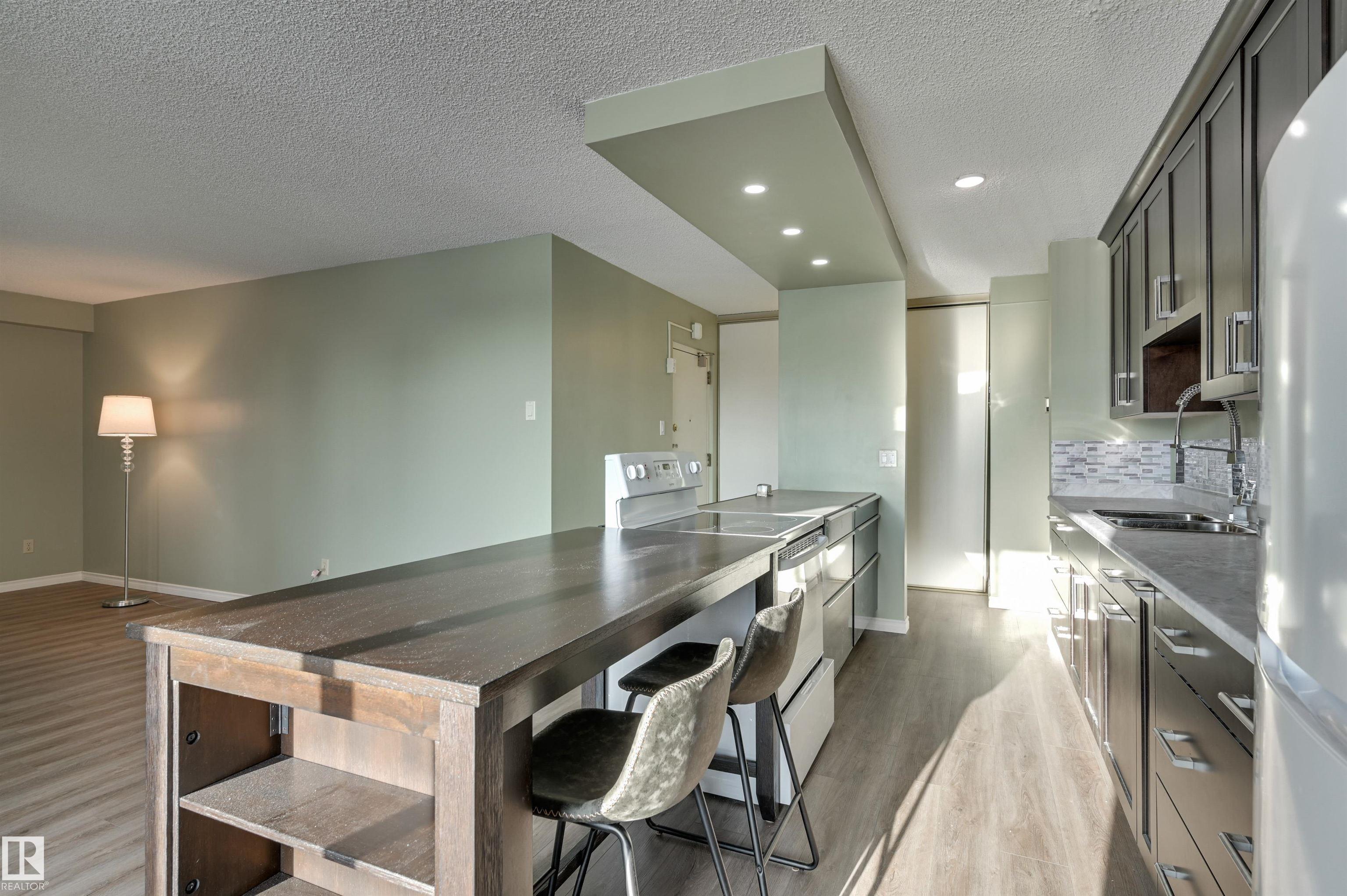 Welcome home to this SOUTHEAST FACING, RENOVATED, TOP FLOOR condo in B & H TOWERS conveniently located close to transportation, restaurants, coffee shops, shopping, the river valley/walking trails, MacEwan University & quick access to the U of A, Brewery & ICE Districts. This OPEN CONCEPT, BRIGHT condo has a gourmet kitchen with an oversize island with room for an eating area & an area for preparing your meals. This upgraded kitchen has Kitchen Craft espresso color cabinetry with soft close cupboards & dr...
