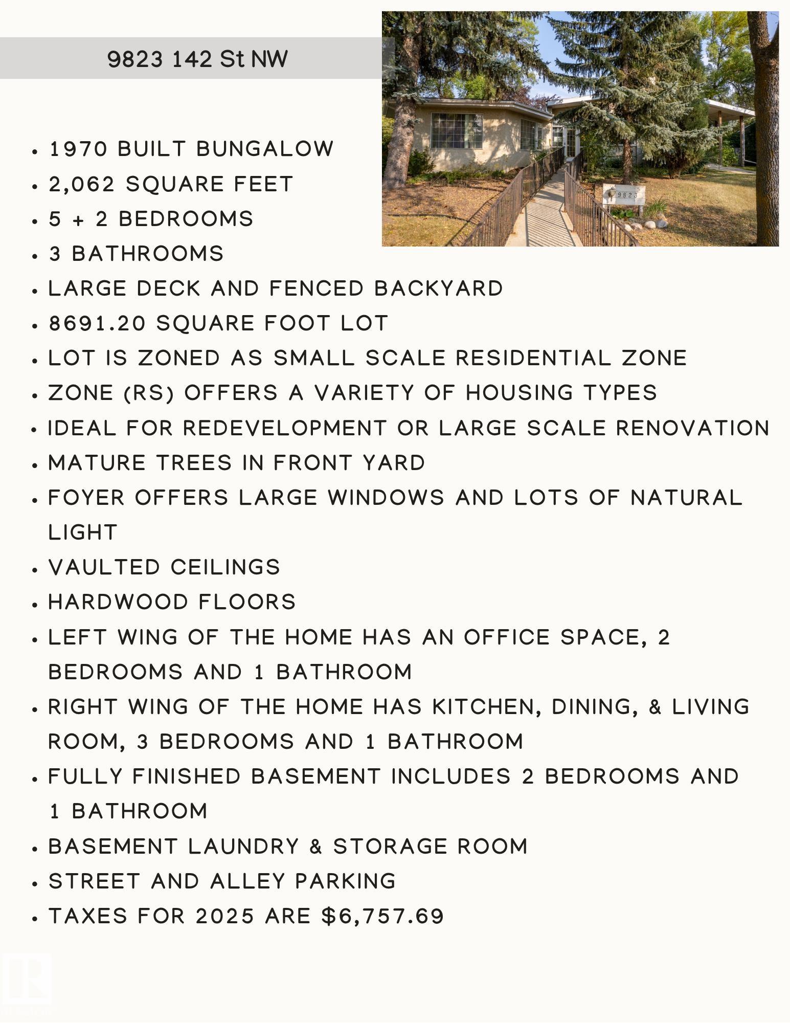 Opportunity in a desirable mature neighbourhood ideal for redevelopment or renovation project. 1970-built bungalow offers 2,062 sq ft of living space with 5+2 bedrooms and 3 bathrooms, plus fully finished basement. There is no garage on the property. 8,686 sq ft (870 m²) lot Zoned RS – Small Scale Residential Zone, allows for a variety of housing types including single family, detached, semi-detached, duplex, row housing, small apartments, or 8-plex (buyer to verify). City of Edmonton assessed value was $70...